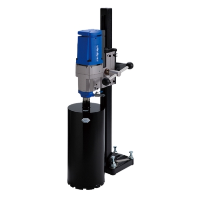 Heavy-duty core drill on stand for wet drilling into concrete, asphalt, and masonry, ideal for large-diameter holes and vertical precision.