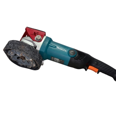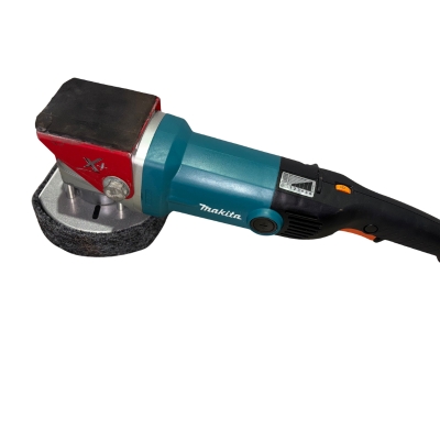 Variable speed hand grinder fitted with open front for grinding and polishing edges along walls and benchtops. Dust shroud connects to small vacuum for dust controlled grinding.